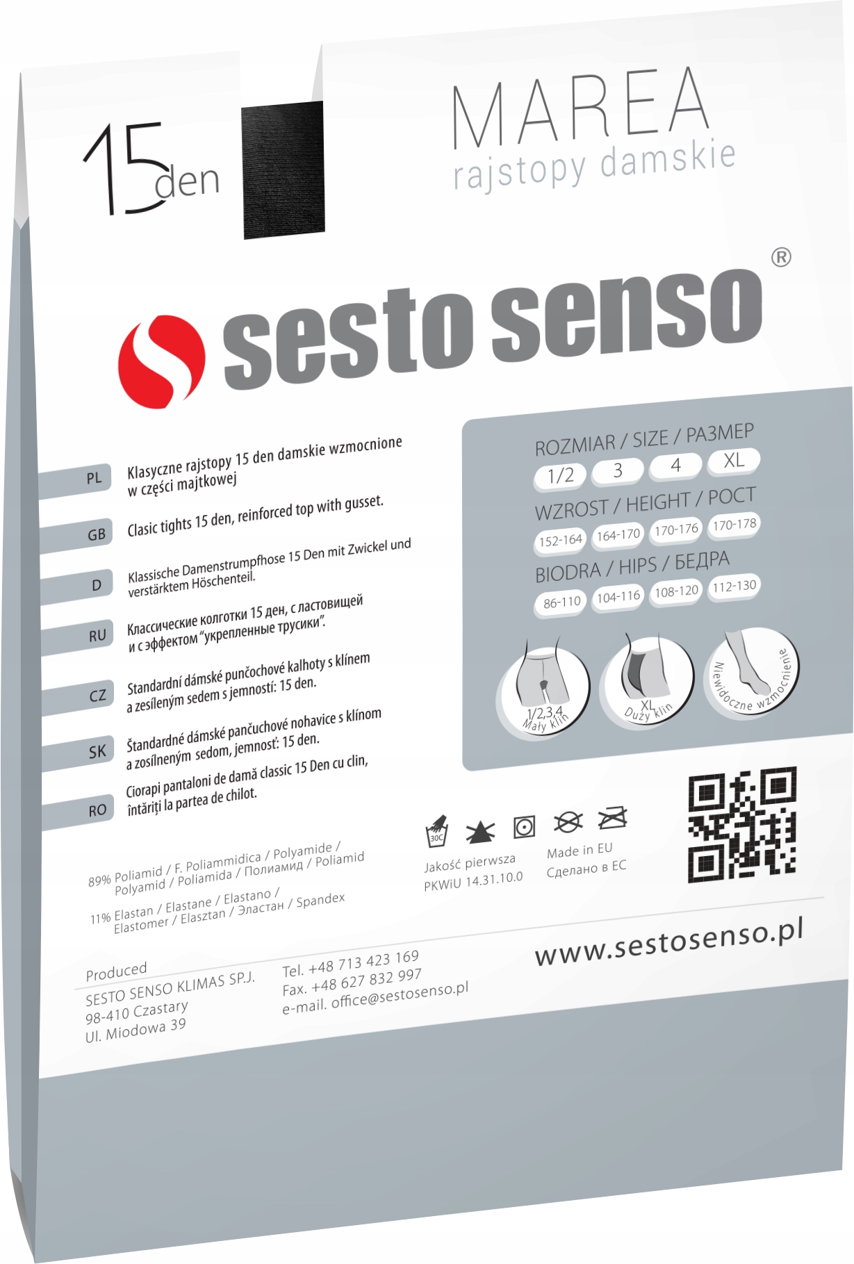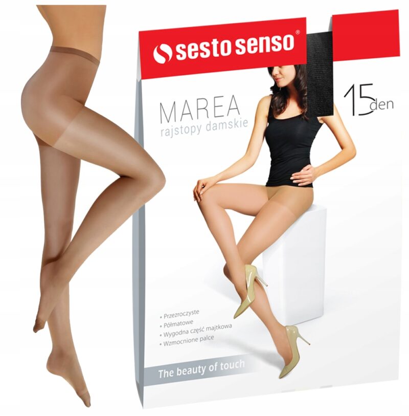 Klasyczne rajstopy damskie 15 DEN MAREA to przezroczyste półmatowe rajstopy. Rajstopy Marea mają wyjątkowo wygodną, wzmocnioną część majtkową oraz wzmocnienie na palcach.